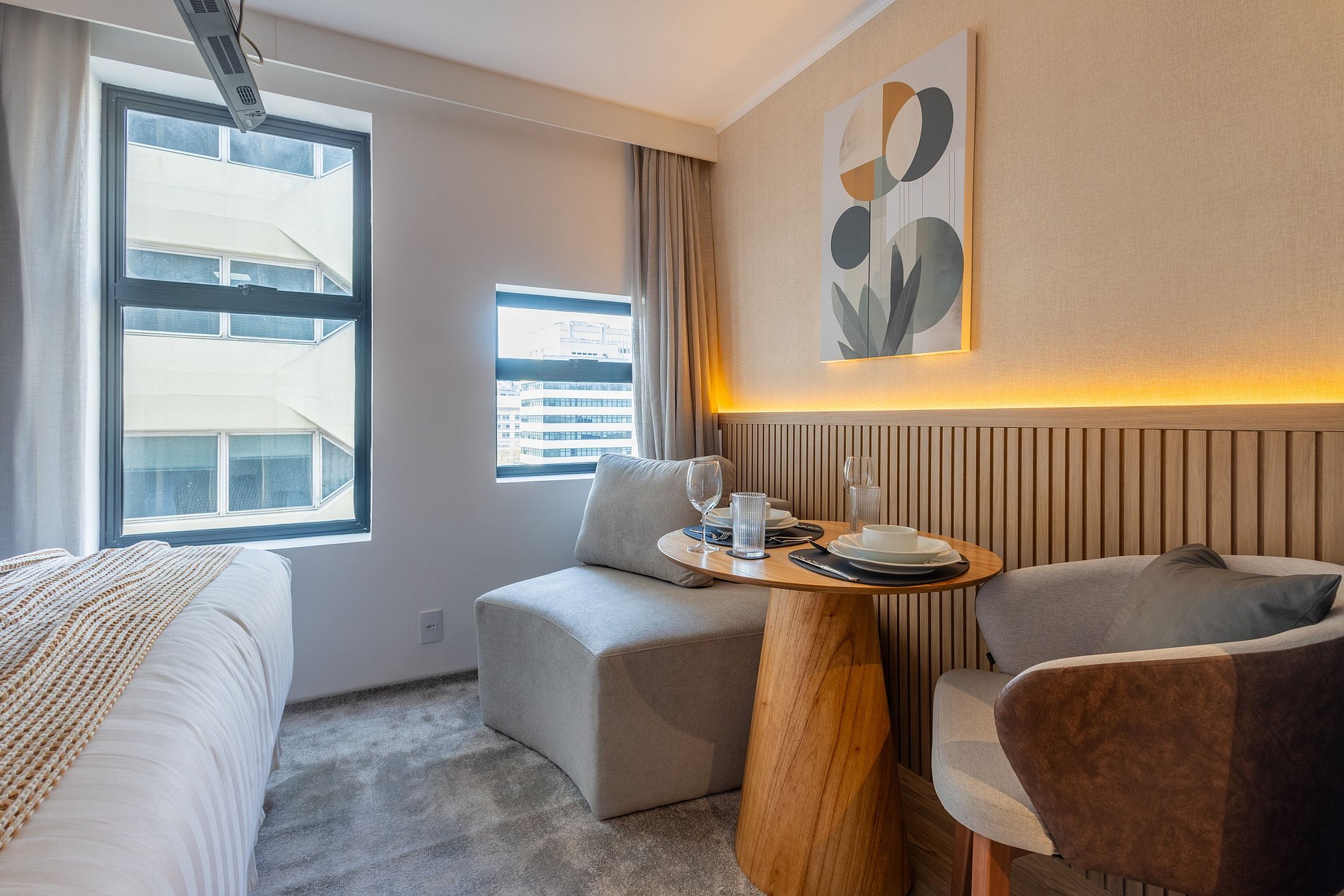Nossos espaços são contemporâneos e práticos, oferecendo tudo o que você precisa para uma estadia confortável: Wi-Fi, TV a cabo, toalhas, roupa de cama completa e uma cozinha equipada com geladeira, cooktop de indução de uma boca, micro-ondas e utensílios.