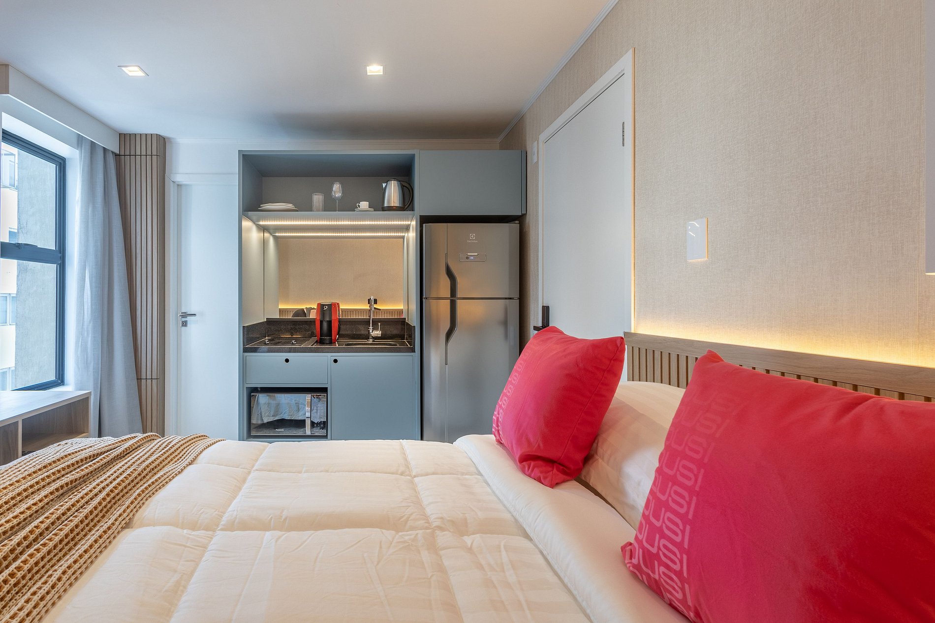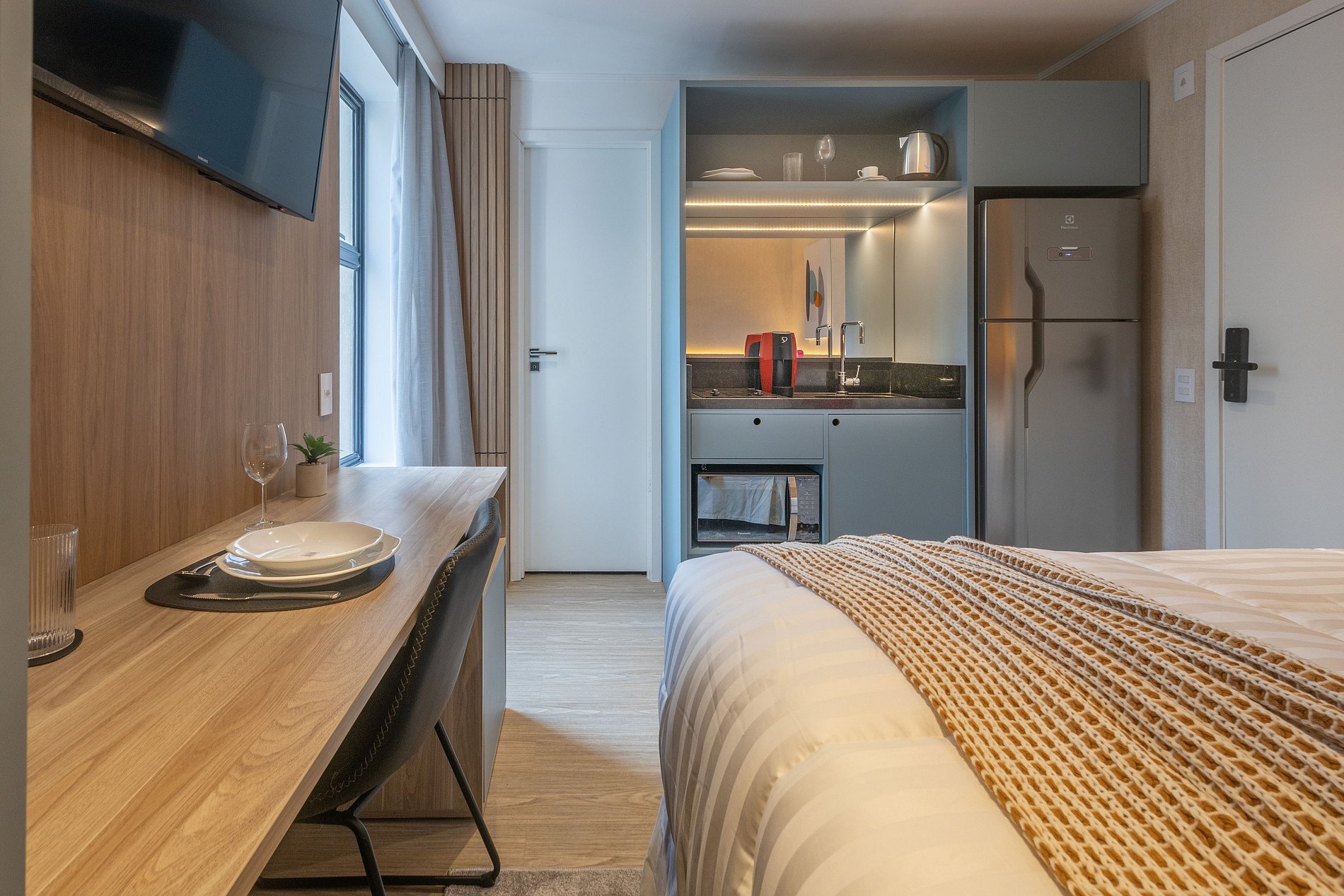 Nossos espaços são contemporâneos e práticos, oferecendo tudo o que você precisa para uma estadia confortável: Wi-Fi, TV, toalhas, roupa de cama completa e uma cozinha equipada com geladeira, cooktop de indução de uma boca, micro-ondas e utensílios.