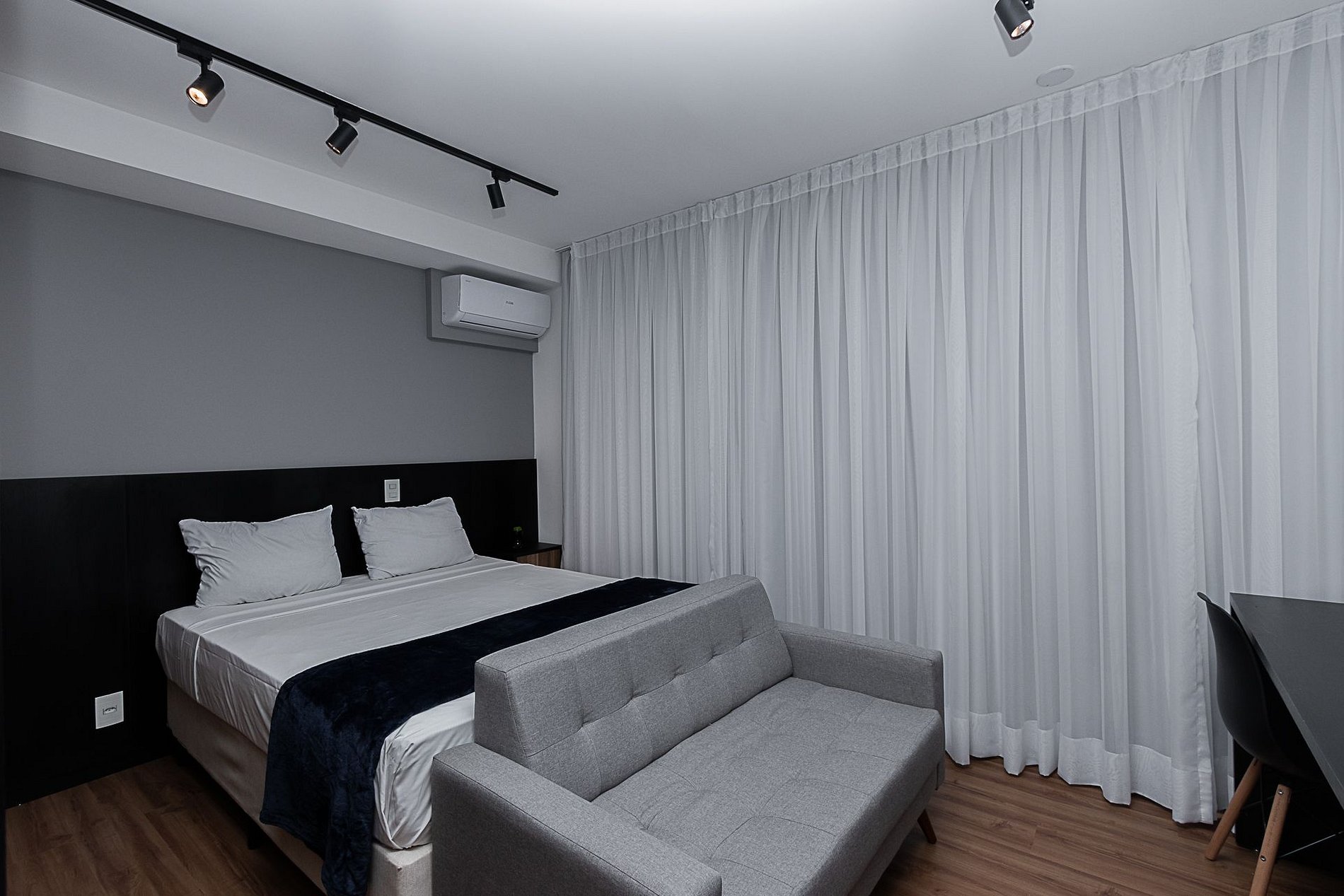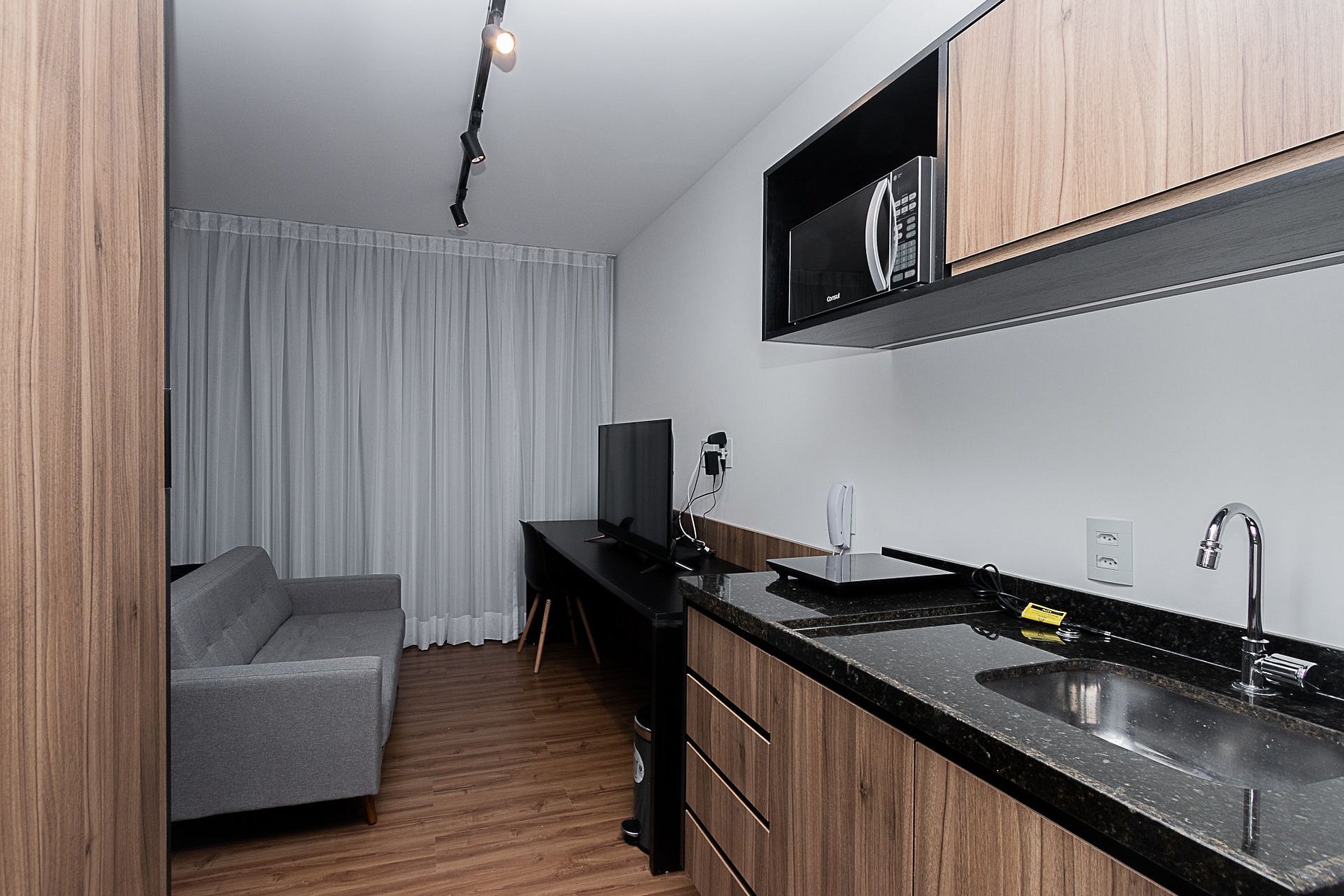 Nossos espaços são contemporâneos e práticos, oferecendo tudo o que você precisa para uma estadia confortável: Wi-Fi, TV a cabo, toalhas, roupa de cama completa e uma cozinha compacta equipada com geladeira, cooktop de indução de uma boca, micro-ondas e utensílios.