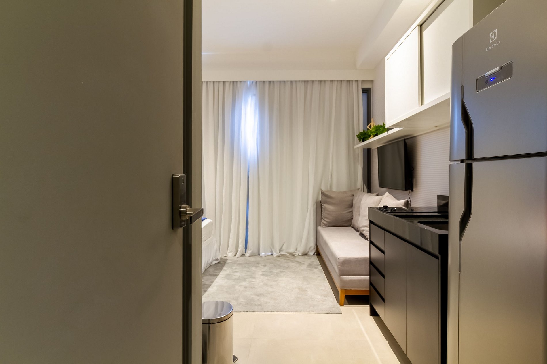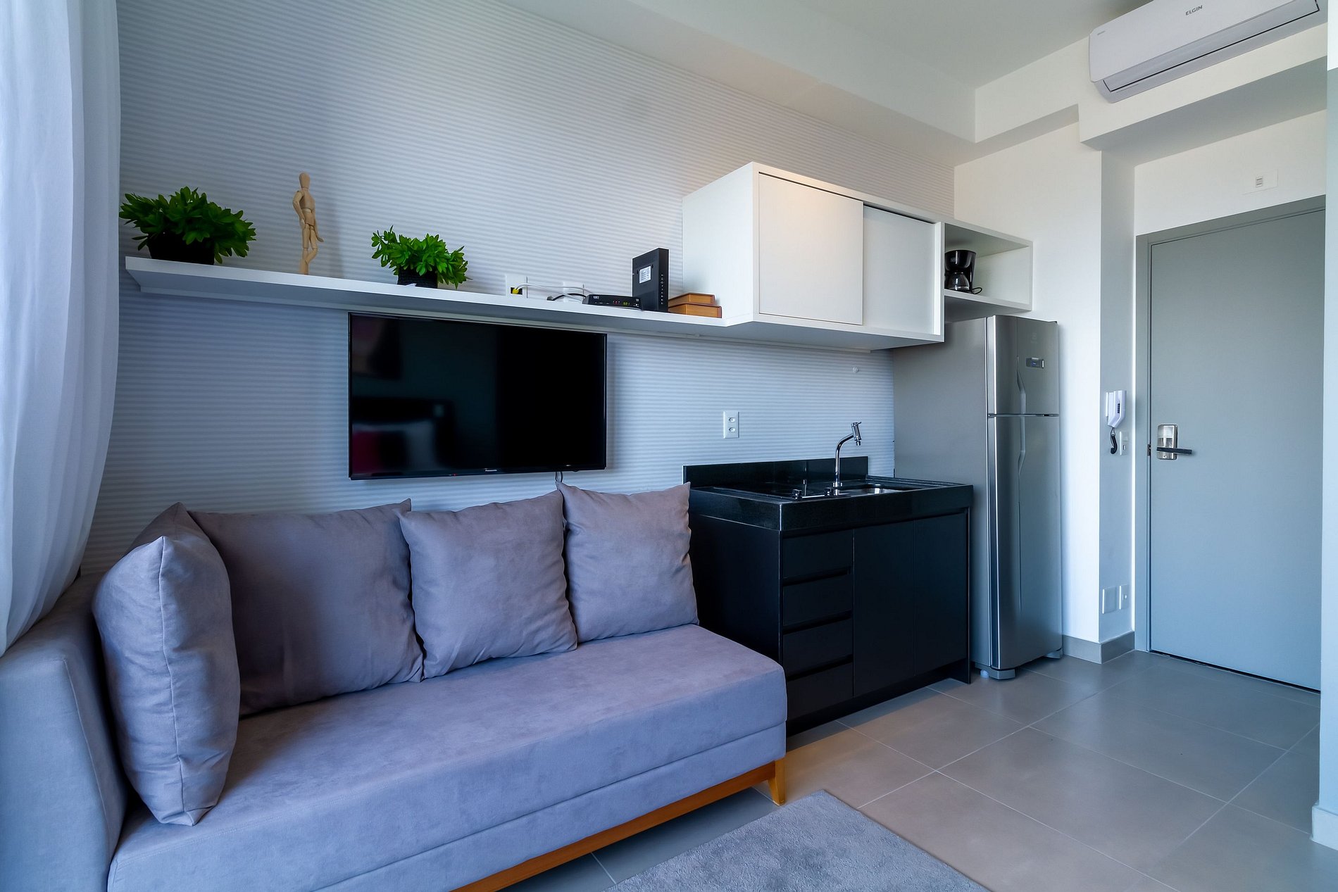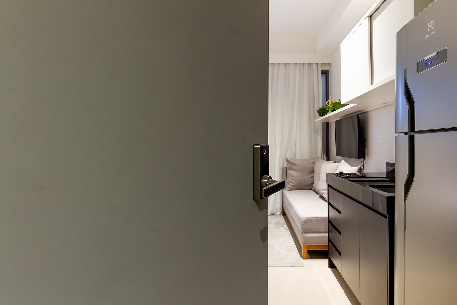 Os apês são todos mobiliados, decorados e equipados. Você tem à disposição Wi-Fi, TV a cabo, toalhas, roupa de cama completa e cozinha com geladeira, cooktop de indução de uma boca, microondas e utensílios. Escolha a sua e vem para Housi você também!