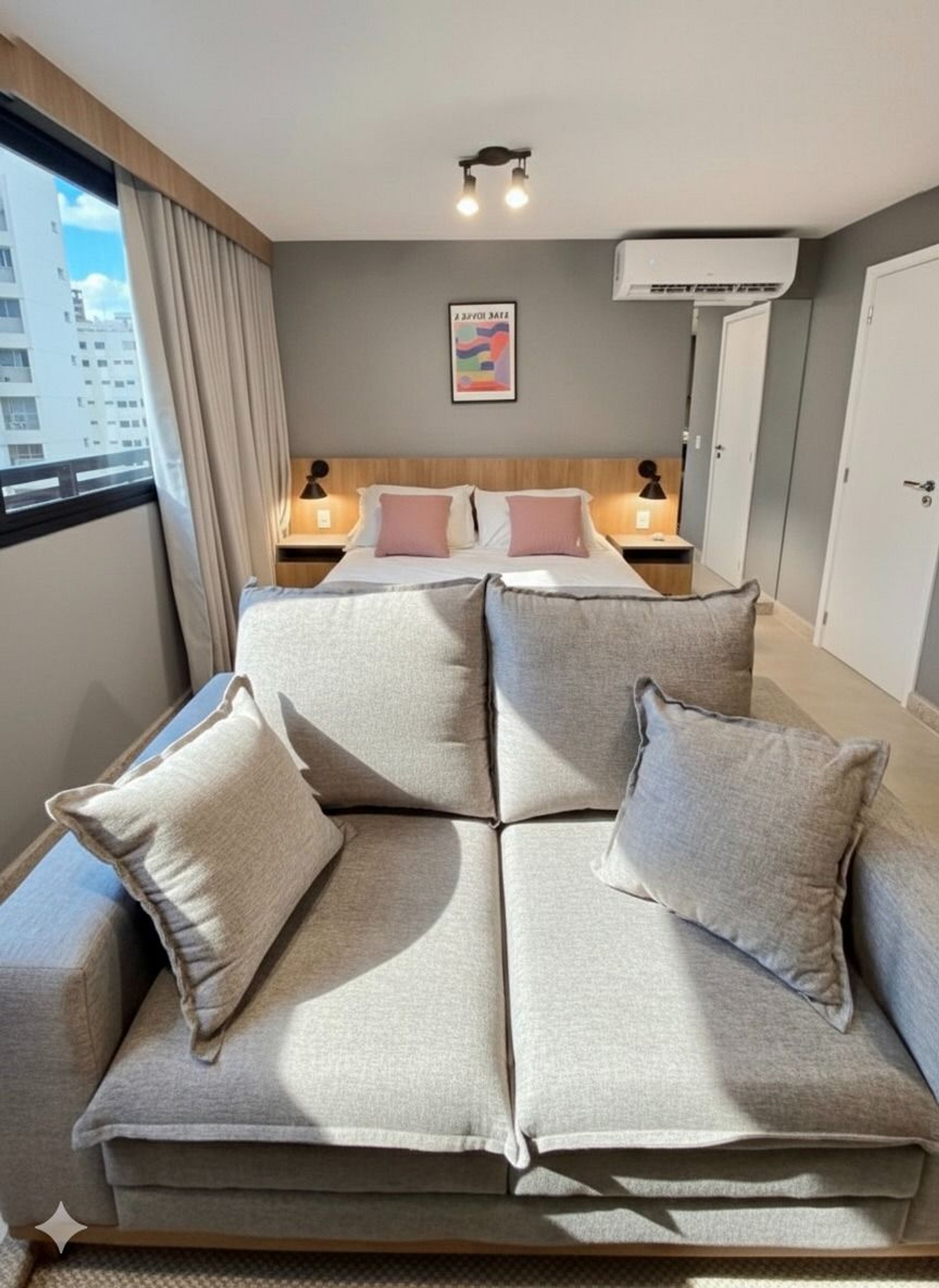 Neste empreendimento exclusivo você encontra studios e apartamentos de 1 quarto, com áreas privativas possuem aproximadamente 28 m².