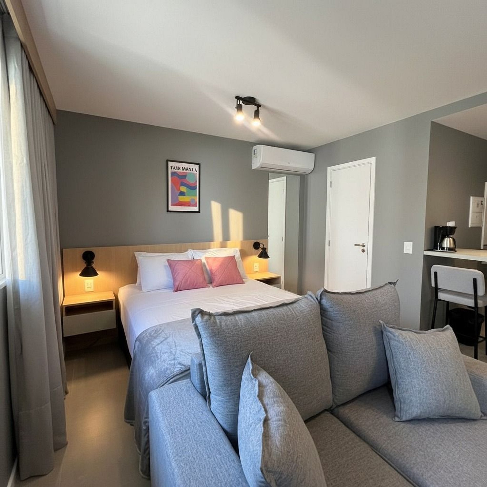 Unidades entregues mobiliadas como opção, com gestão HOUSI para limpeza, manutenção e locação.