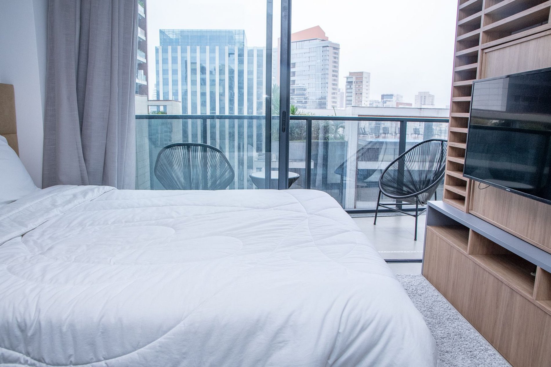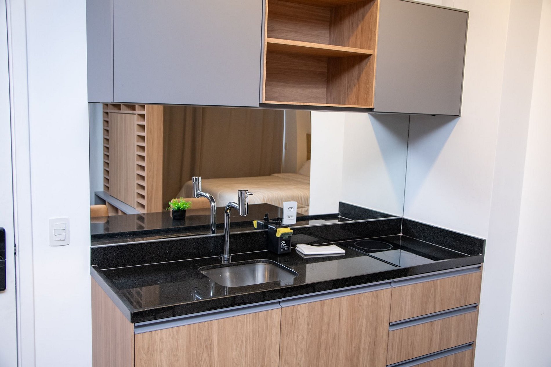 Nossos espaços são contemporâneos e práticos, oferecendo tudo o que você precisa para uma estadia confortável: Wi-Fi, TV a cabo, toalhas, roupa de cama completa e uma cozinha compacta equipada com geladeira, cooktop de indução de uma boca, micro-ondas e utensílios.