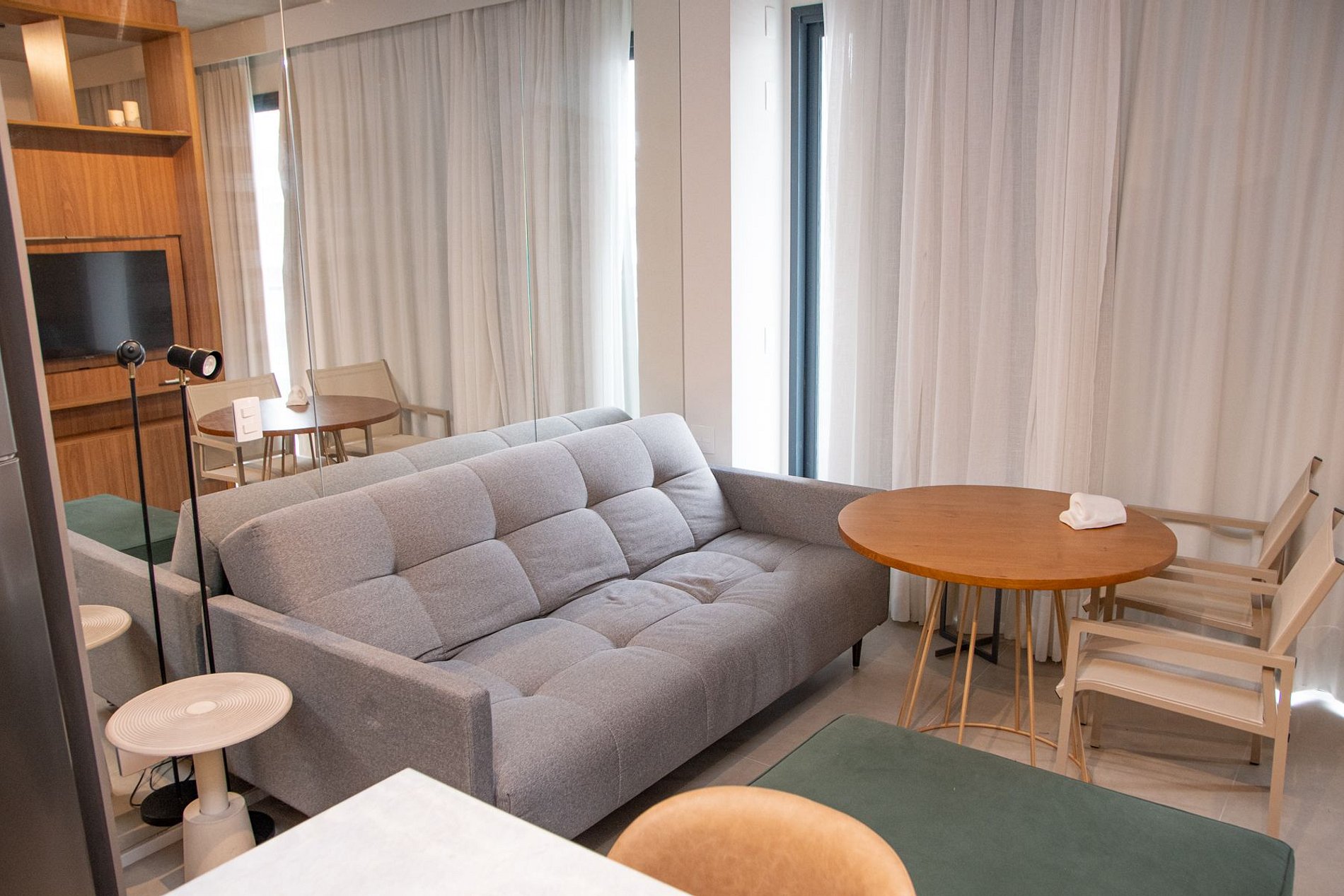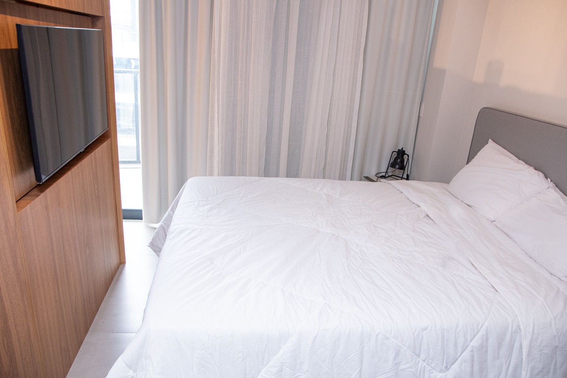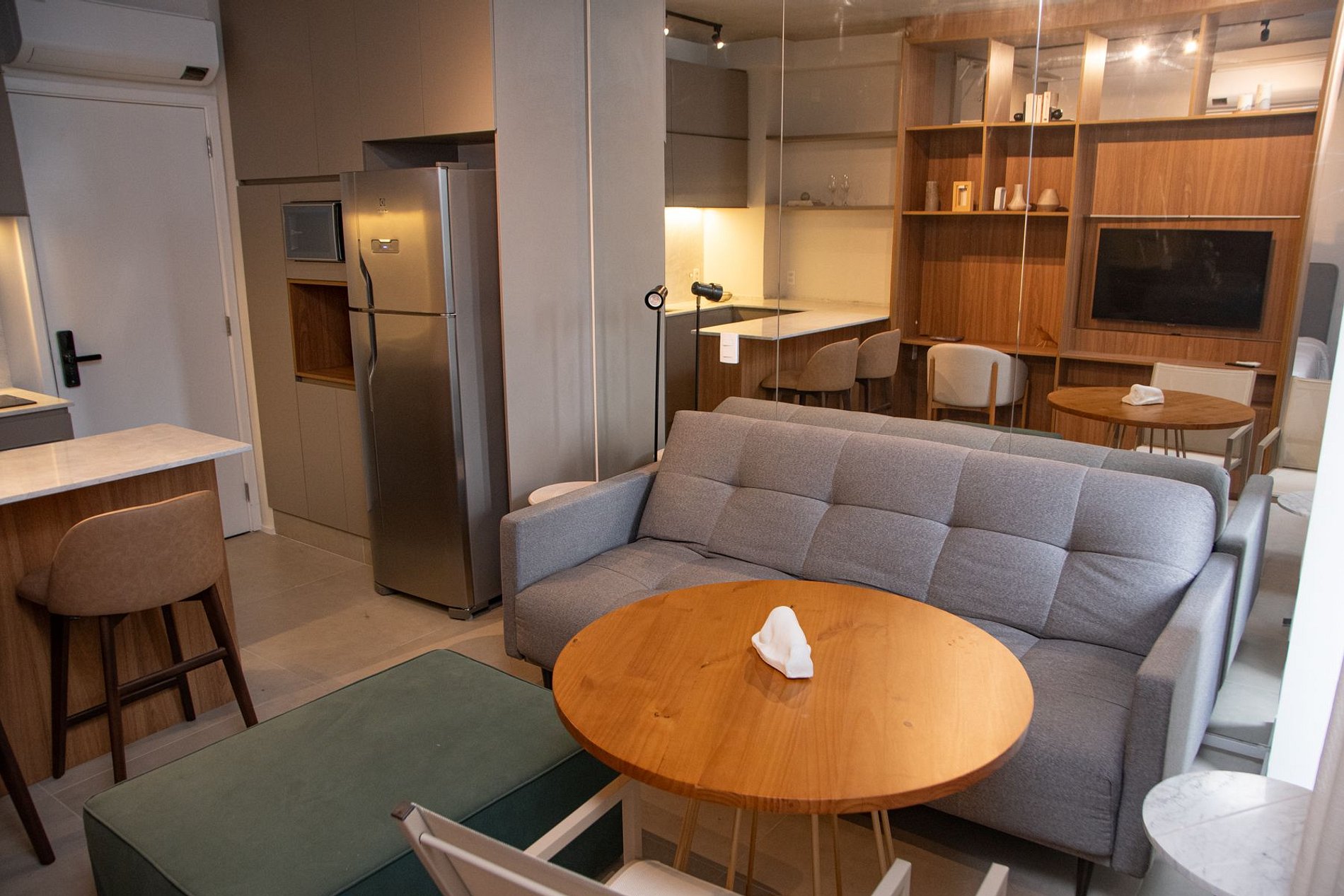 Nossos espaços são contemporâneos e práticos, oferecendo tudo o que você precisa para uma estadia confortável: Wi-Fi, TV a cabo, toalhas, roupa de cama completa e uma cozinha compacta equipada com geladeira, cooktop de indução de uma boca, micro-ondas e utensílios.