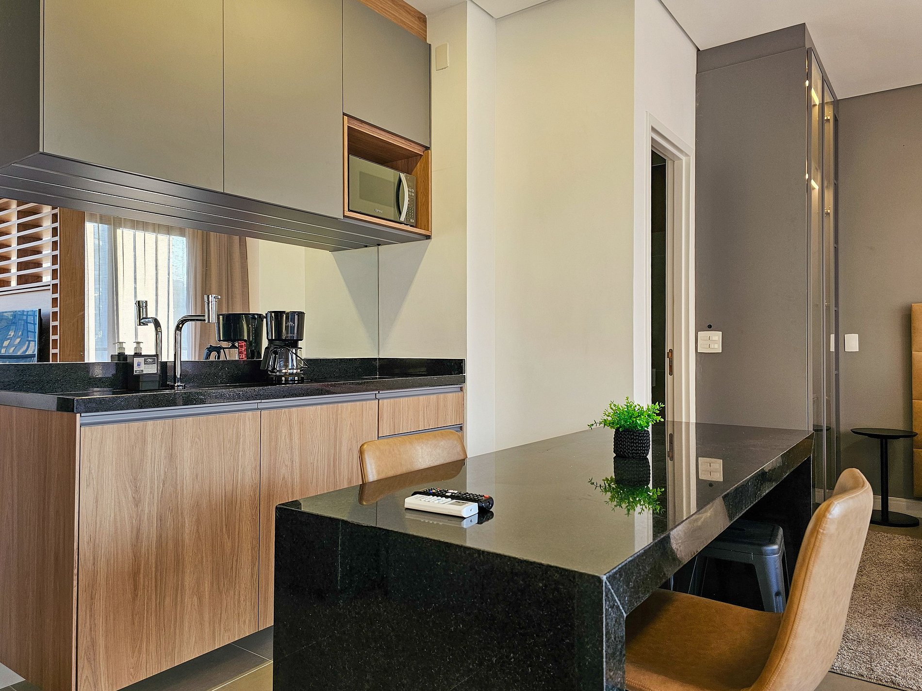 Nossos espaços são contemporâneos e práticos, oferecendo tudo o que você precisa para uma estadia confortável: Wi-Fi, TV a cabo, toalhas, roupa de cama completa e uma cozinha compacta equipada com geladeira, cooktop de indução de uma boca, micro-ondas e utensílios.