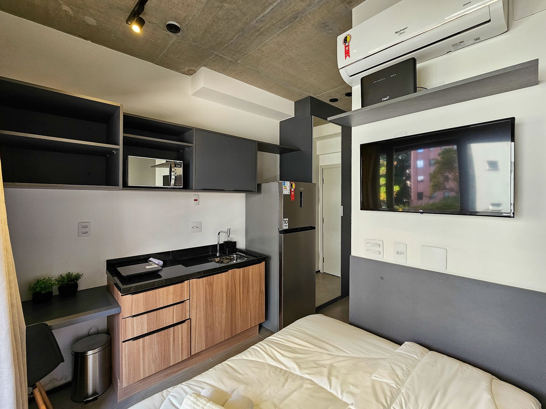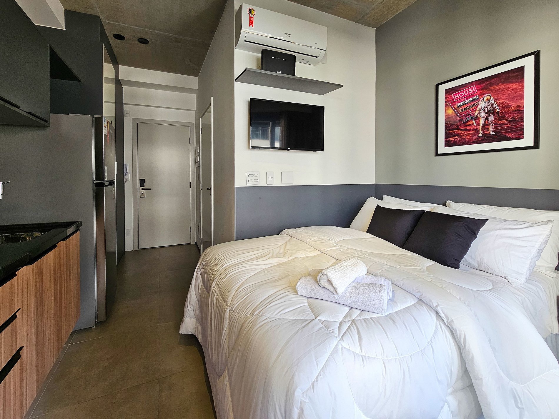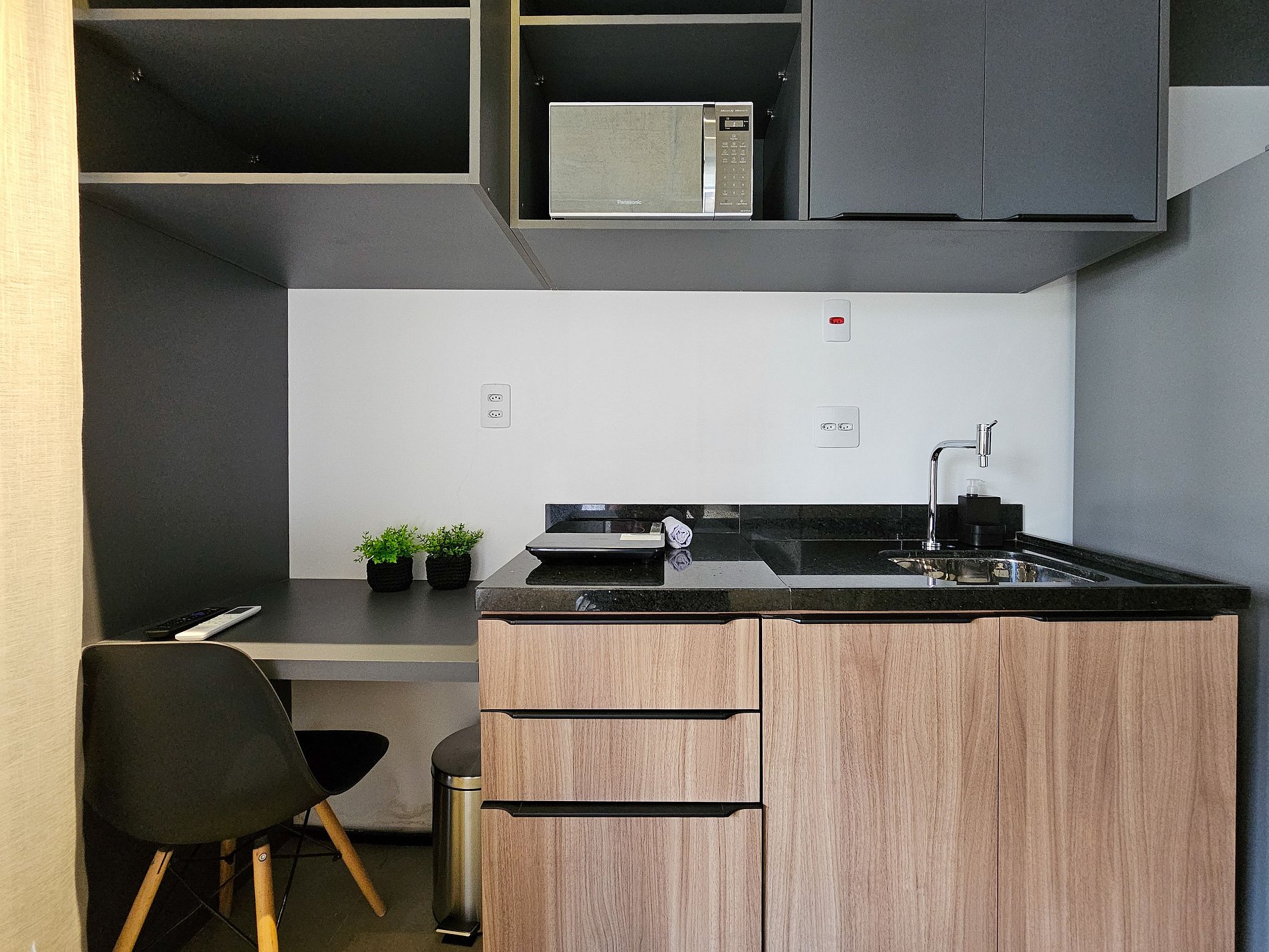 Nossos espaços são contemporâneos e práticos, oferecendo tudo o que você precisa para uma estadia confortável: Wi-Fi, TV a cabo, toalhas, roupa de cama completa e uma cozinha compacta equipada com geladeira, cooktop de indução de uma boca, micro-ondas e utensílios.