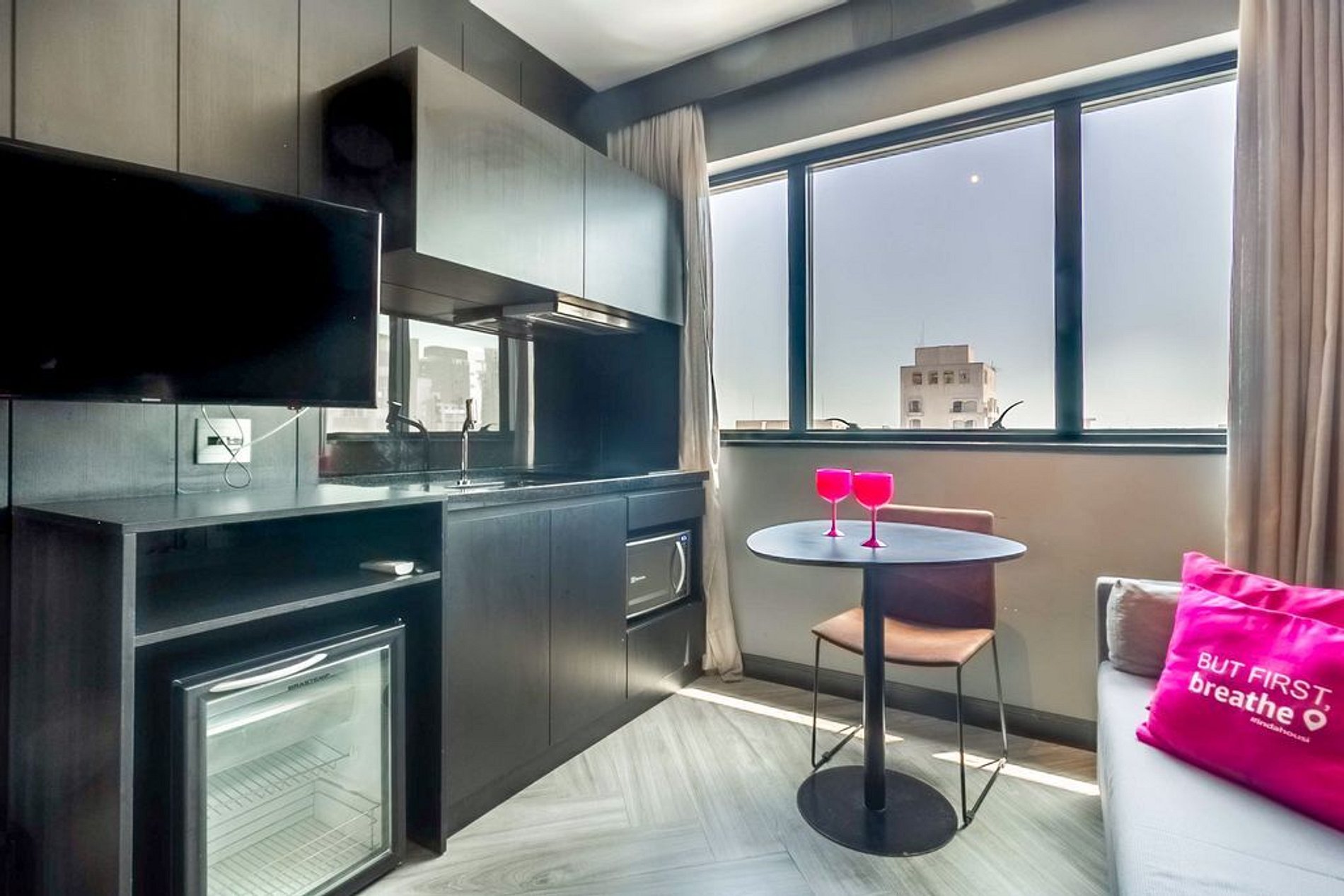 Nossos espaços são modernos e funcionais, equipados com o que você precisa para uma estadia confortável: Wi-Fi, TV a cabo, toalhas, roupa de cama completa e uma cozinha equipada cooktop de indução de uma boca, microondas e utensílios.