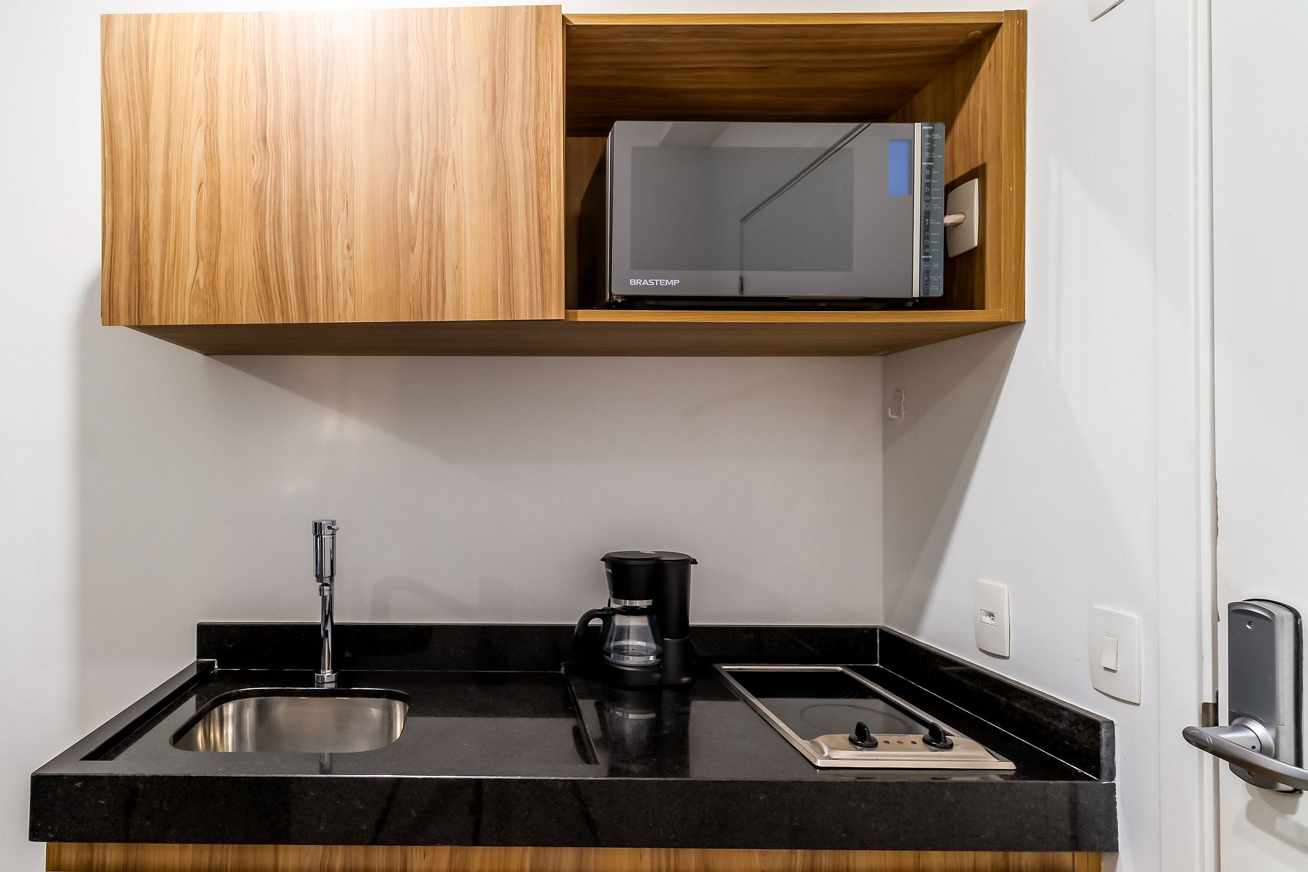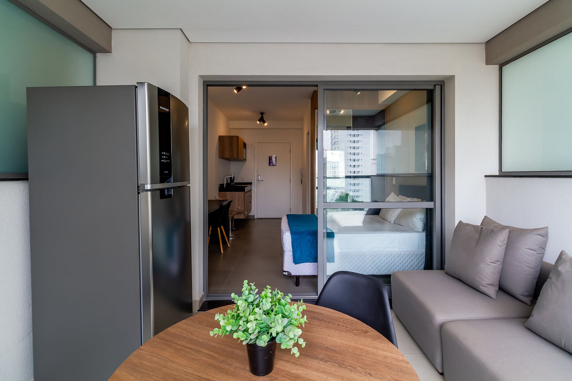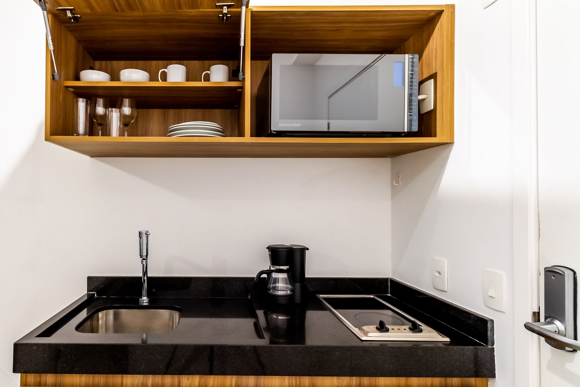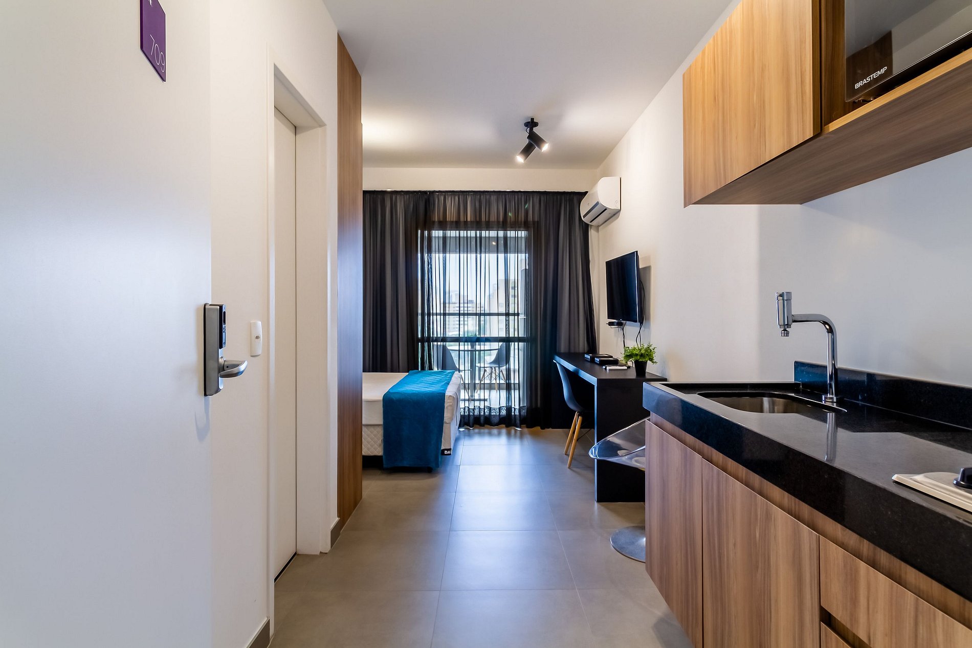 Os apês são todos mobiliados, decorados e equipados. Você tem à disposição Wi-Fi, TV a cabo, toalhas, roupa de cama completa e cozinha com geladeira, cooktop de indução de uma boca, microondas e utensílios. Escolha a sua e vem para Housi você também!