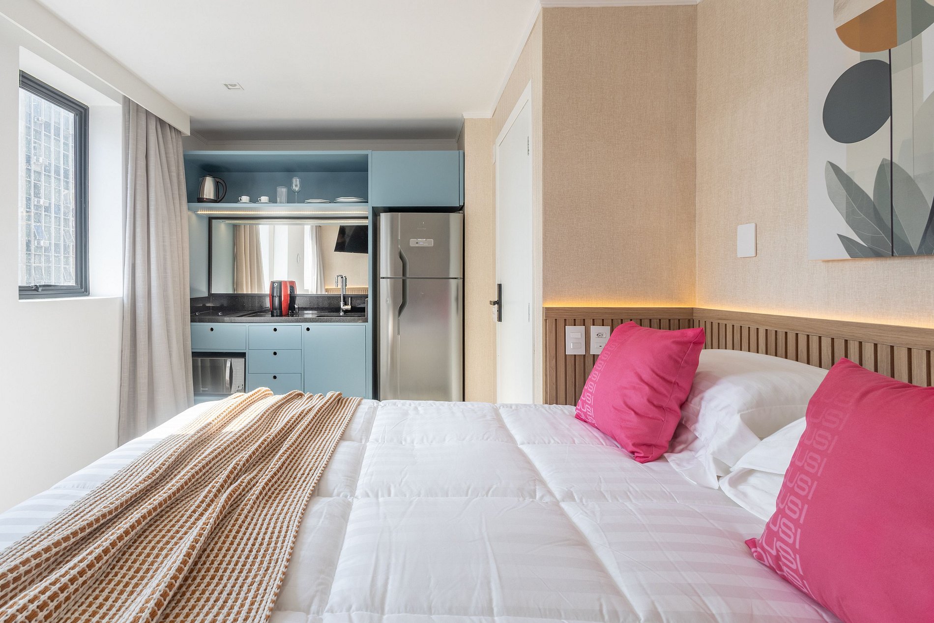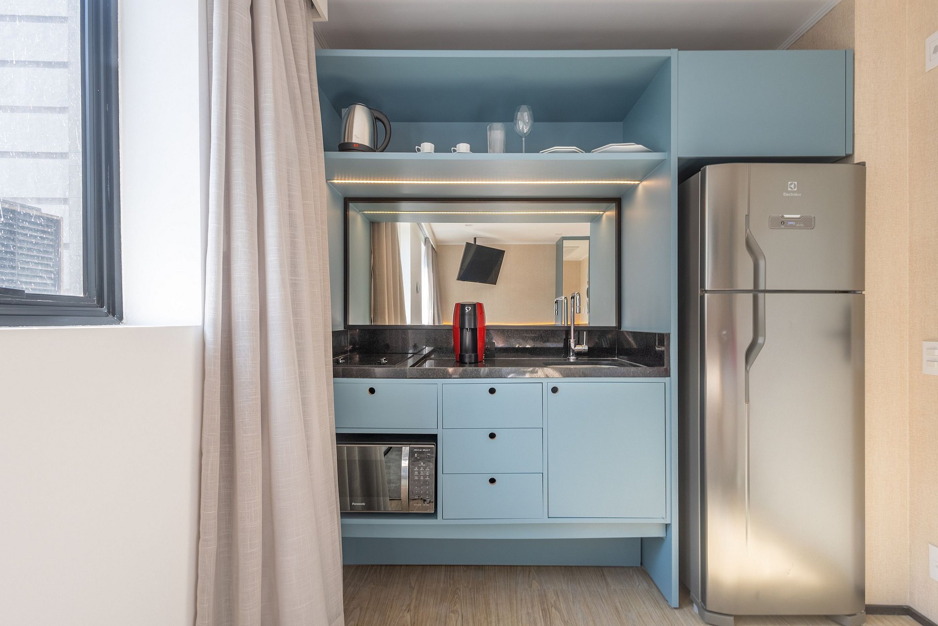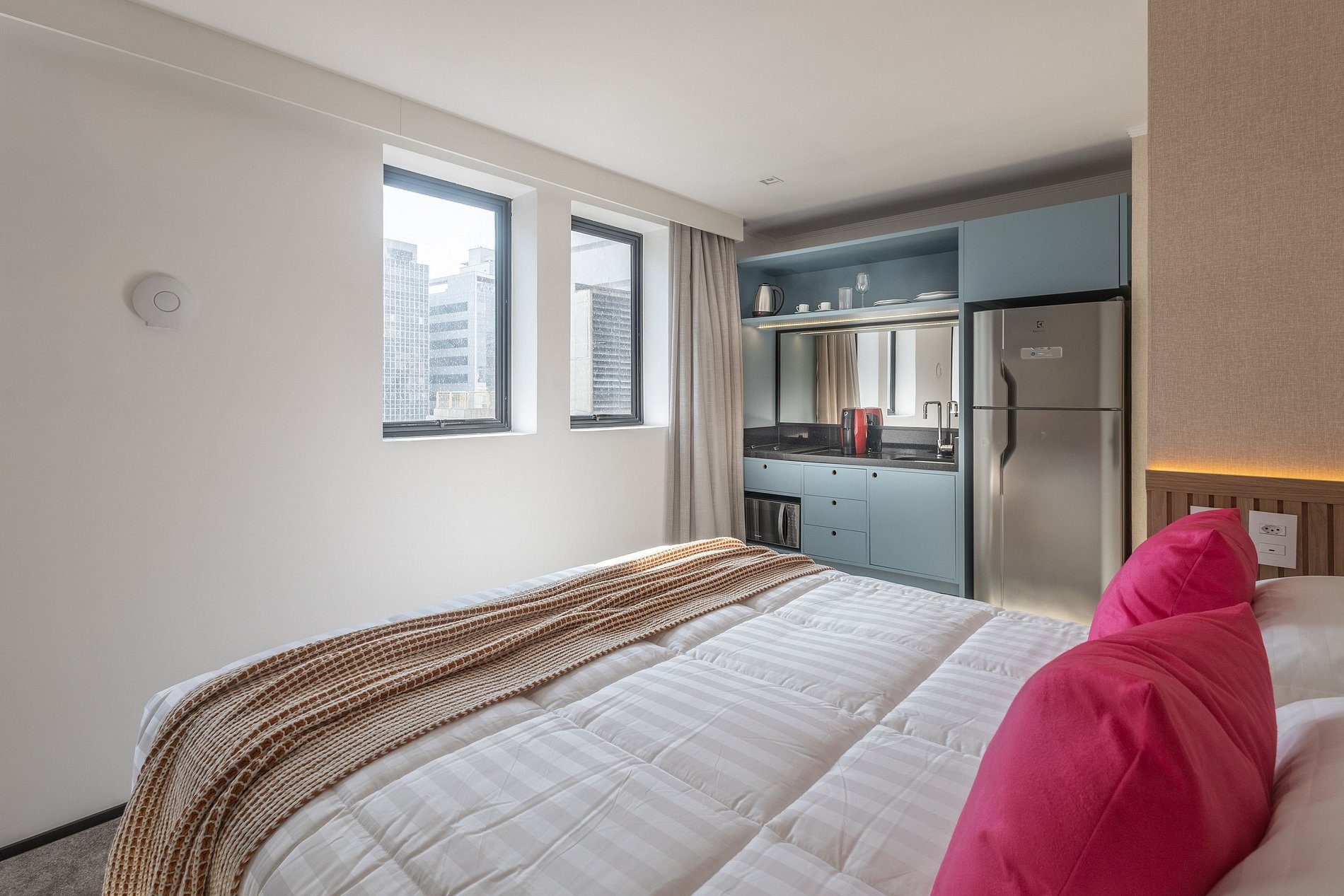 Nossos espaços são contemporâneos e práticos, oferecendo tudo o que você precisa para uma estadia confortável: Wi-Fi, TV a cabo, toalhas, roupa de cama completa e uma cozinha equipada com geladeira, cooktop de indução de uma boca, micro-ondas e
