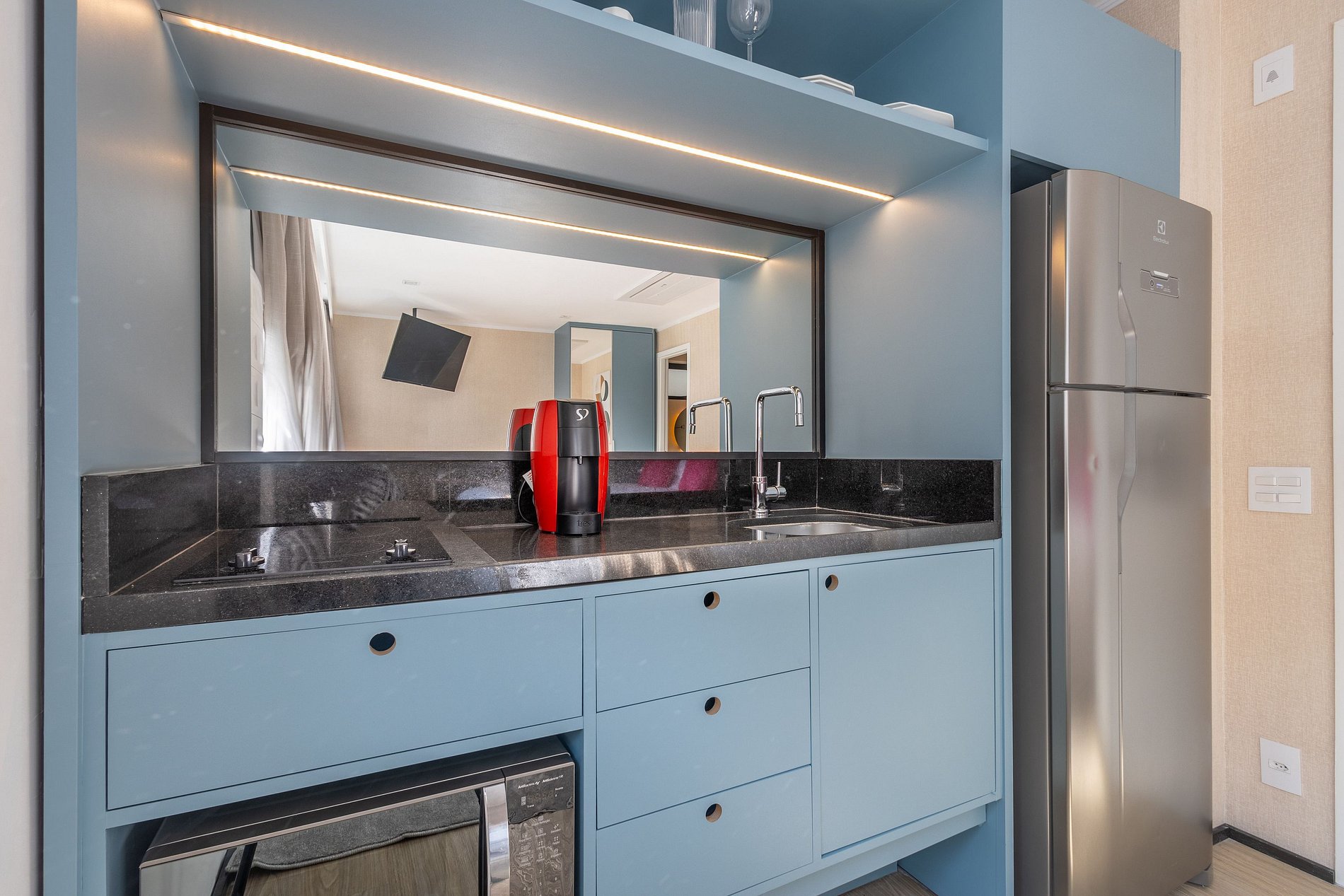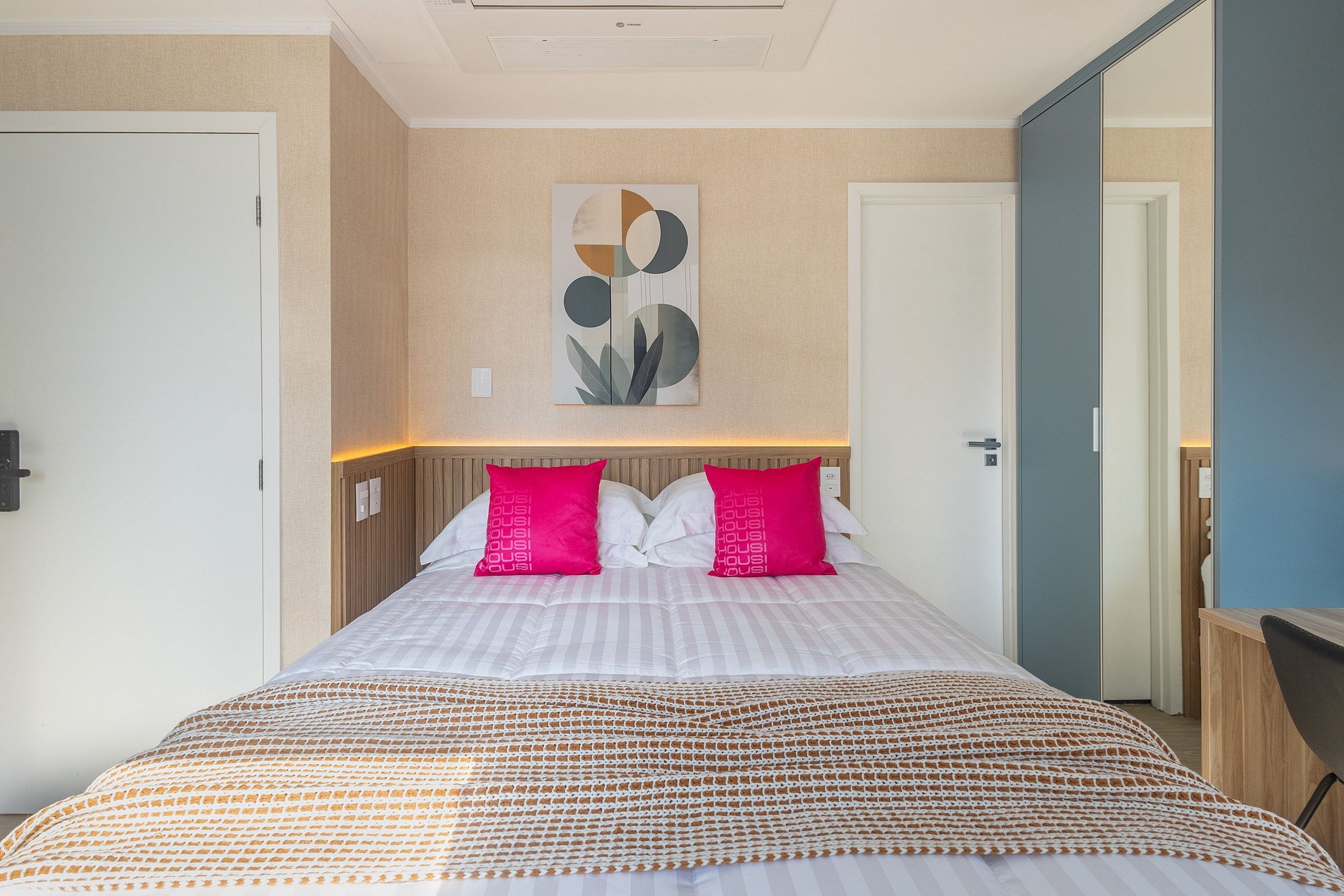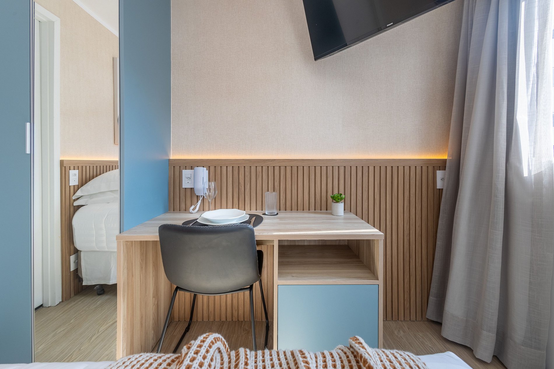 Nossos espaços são contemporâneos e práticos, oferecendo tudo o que você precisa para uma estadia confortável: Wi-Fi, TV a cabo, toalhas, roupa de cama completa e uma cozinha equipada com geladeira, cooktop de indução de uma boca, micro-ondas e