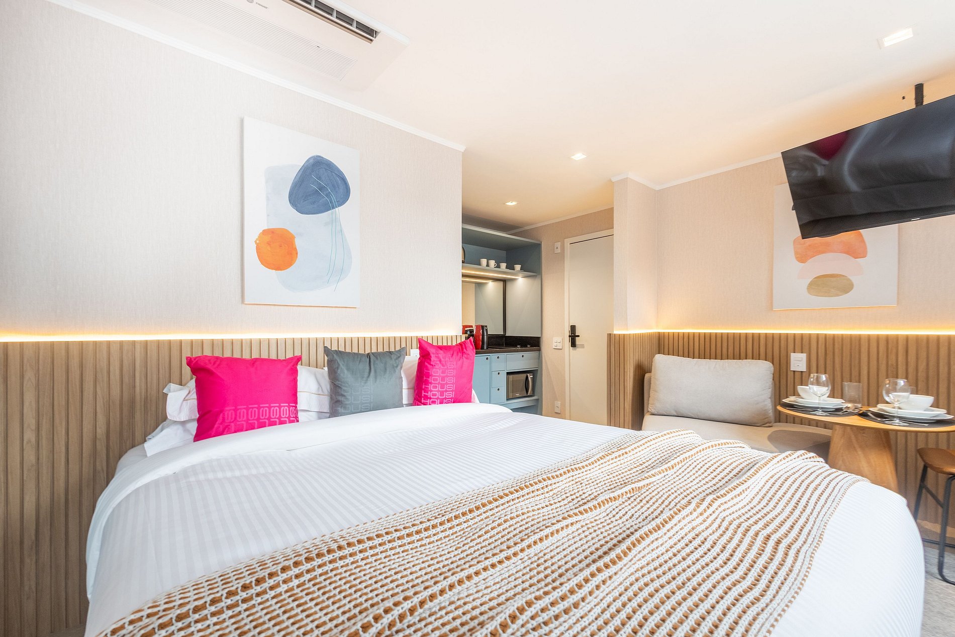 Nossos espaços são contemporâneos e práticos, oferecendo tudo o que você precisa para uma estadia confortável: Wi-Fi, TV a cabo, toalhas, roupa de cama completa e uma cozinha equipada com geladeira, cooktop de indução de uma boca, micro-ondas e