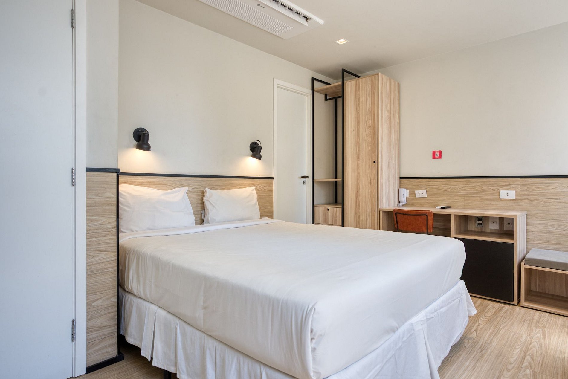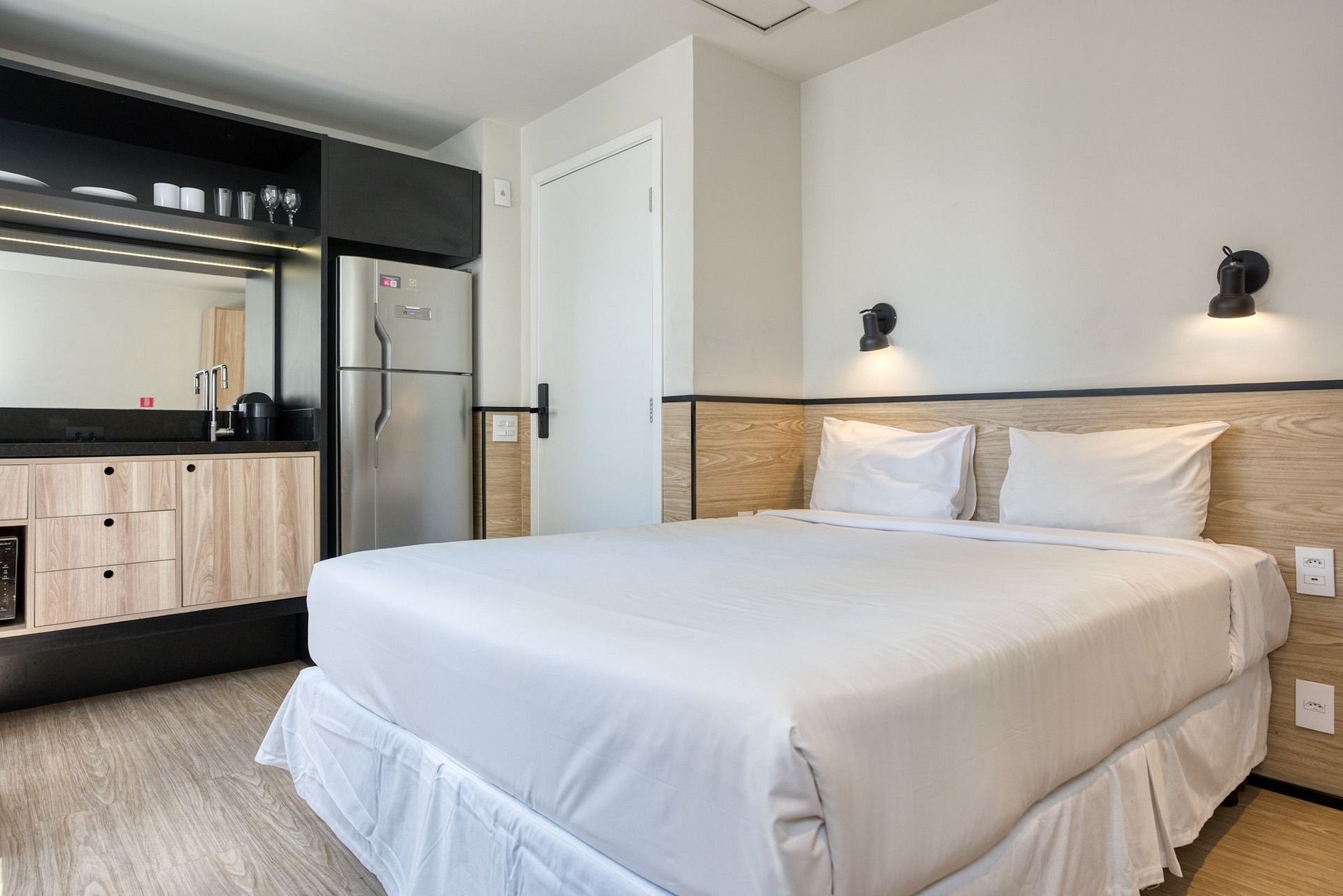 Nossos espaços são contemporâneos e práticos, oferecendo tudo o que você precisa para uma estadia confortável: Wi-Fi, TV a cabo, toalhas, roupa de cama completa e uma cozinha equipada com geladeira, cooktop de indução de uma boca, micro-ondas e