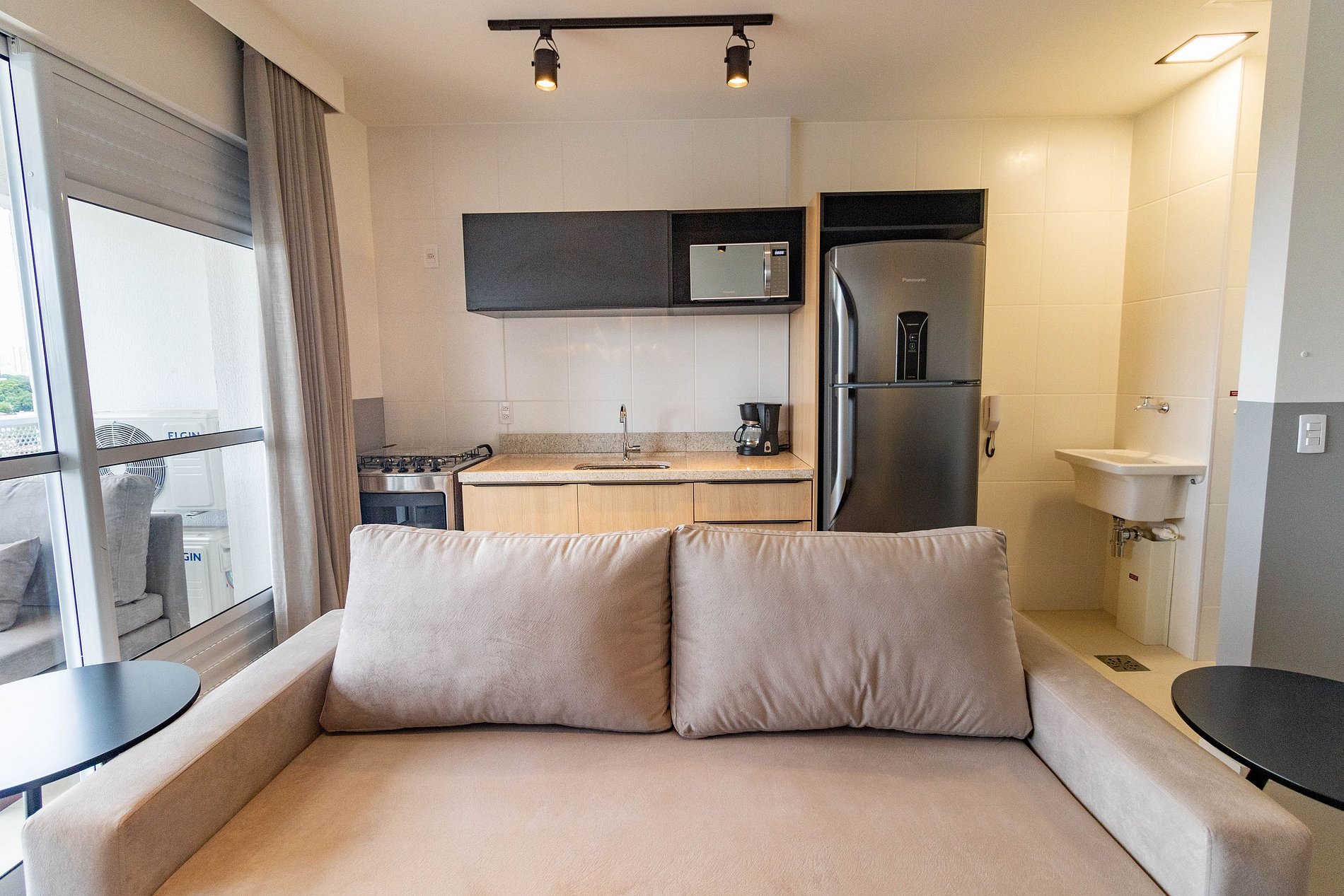 O apartamento de 1 quarto com varanda tem 45m² e é todo mobiliado, decorado e equipado. Você tem à disposição Wi-Fi, TV a cabo, toalhas, roupa de cama completa e cozinha com geladeira, cooktop, microondas e utensílios.