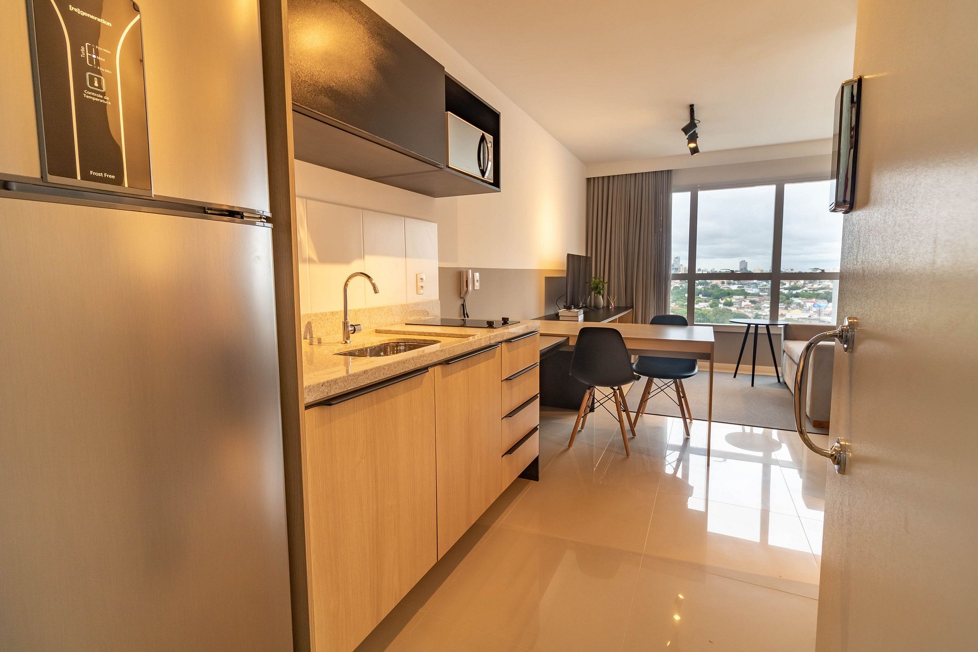 O Studio de 37m² é todo mobiliado, decorado e equipado. Você tem à disposição Wi-Fi, TV a cabo, toalhas, roupa de cama completa e cozinha com geladeira, cooktop, microondas e utensílios. Escolha a sua e vem para Housi você também