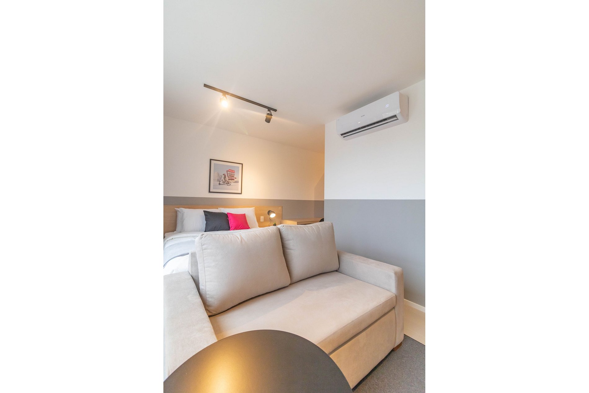 O Studio de 37m² é todo mobiliado, decorado e equipado. Você tem à disposição Wi-Fi, TV a cabo, toalhas, roupa de cama completa e cozinha com geladeira, cooktop, microondas e utensílios. Escolha a sua e vem para Housi você também