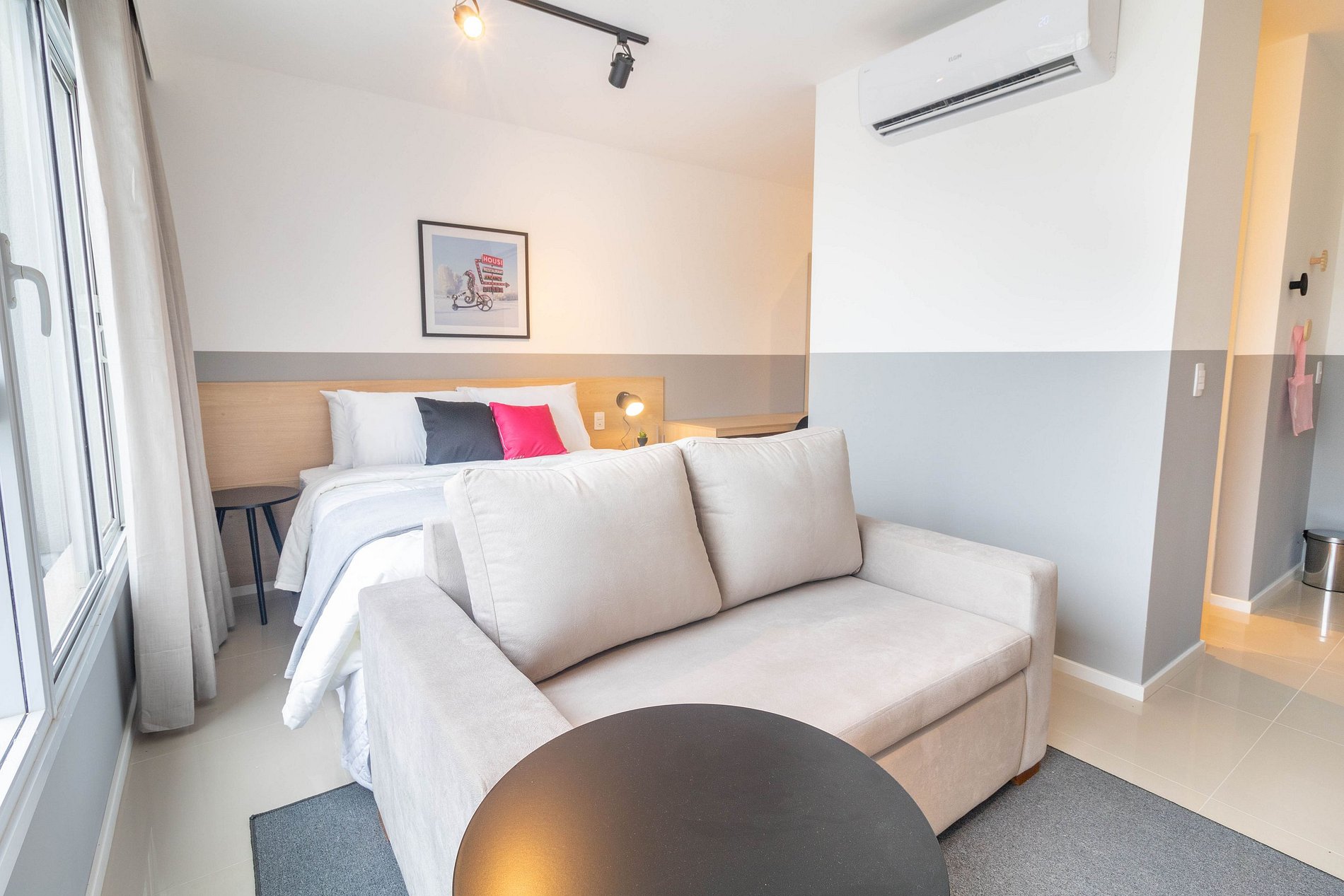 O Studio de 37m² é todo mobiliado, decorado e equipado. Você tem à disposição Wi-Fi, TV a cabo, toalhas, roupa de cama completa e cozinha com geladeira, cooktop, microondas e utensílios. Escolha a sua e vem para Housi você também