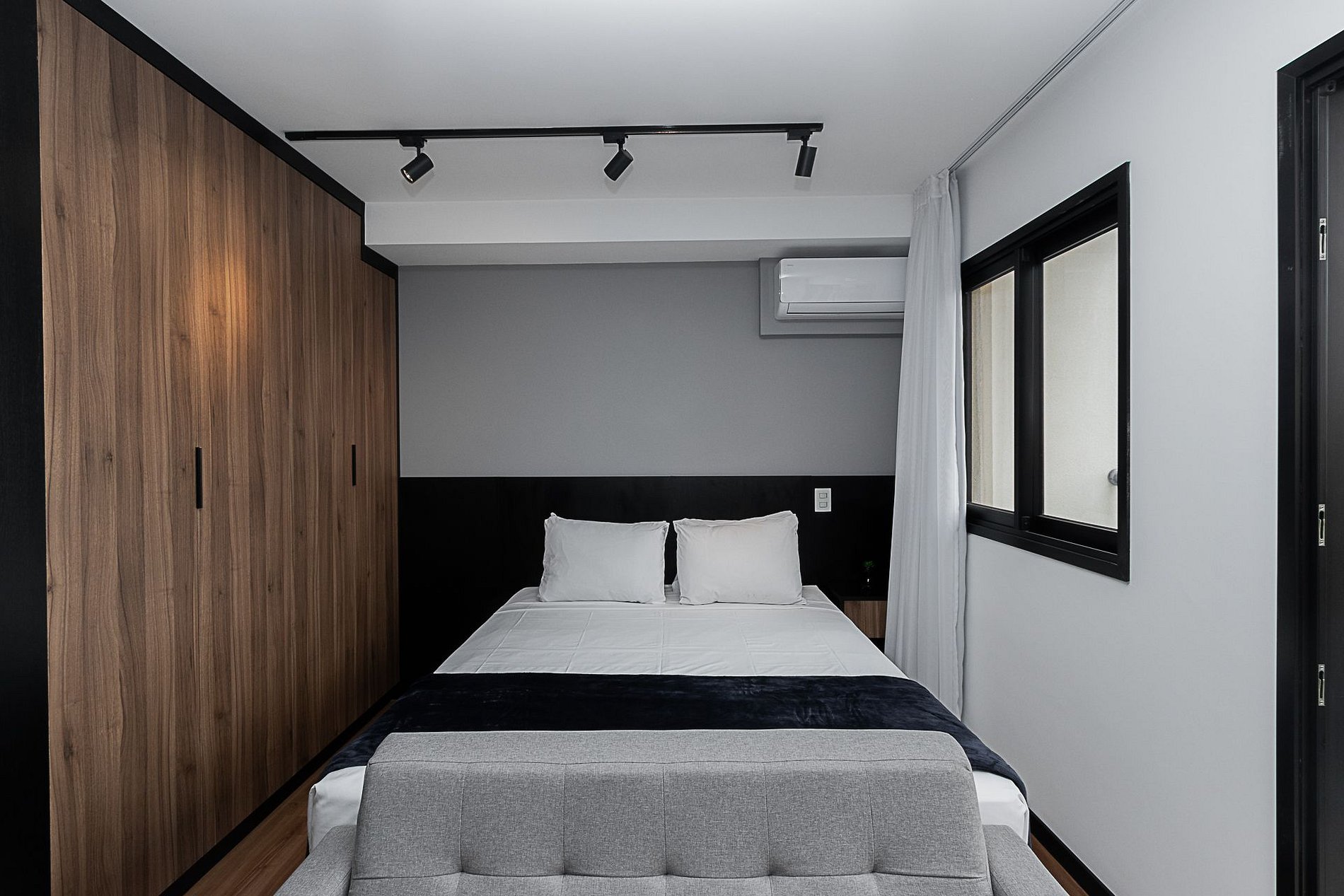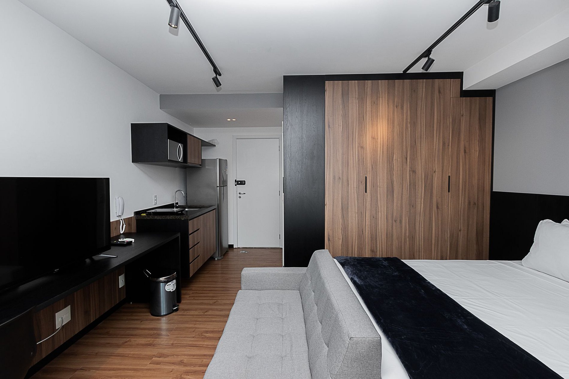 Nossos espaços são contemporâneos e práticos, oferecendo tudo o que você precisa para uma estadia confortável: Wi-Fi, TV a cabo, toalhas, roupa de cama completa e uma cozinha compacta equipada com geladeira, cooktop de indução de uma boca, micro-ondas e utensílios.
