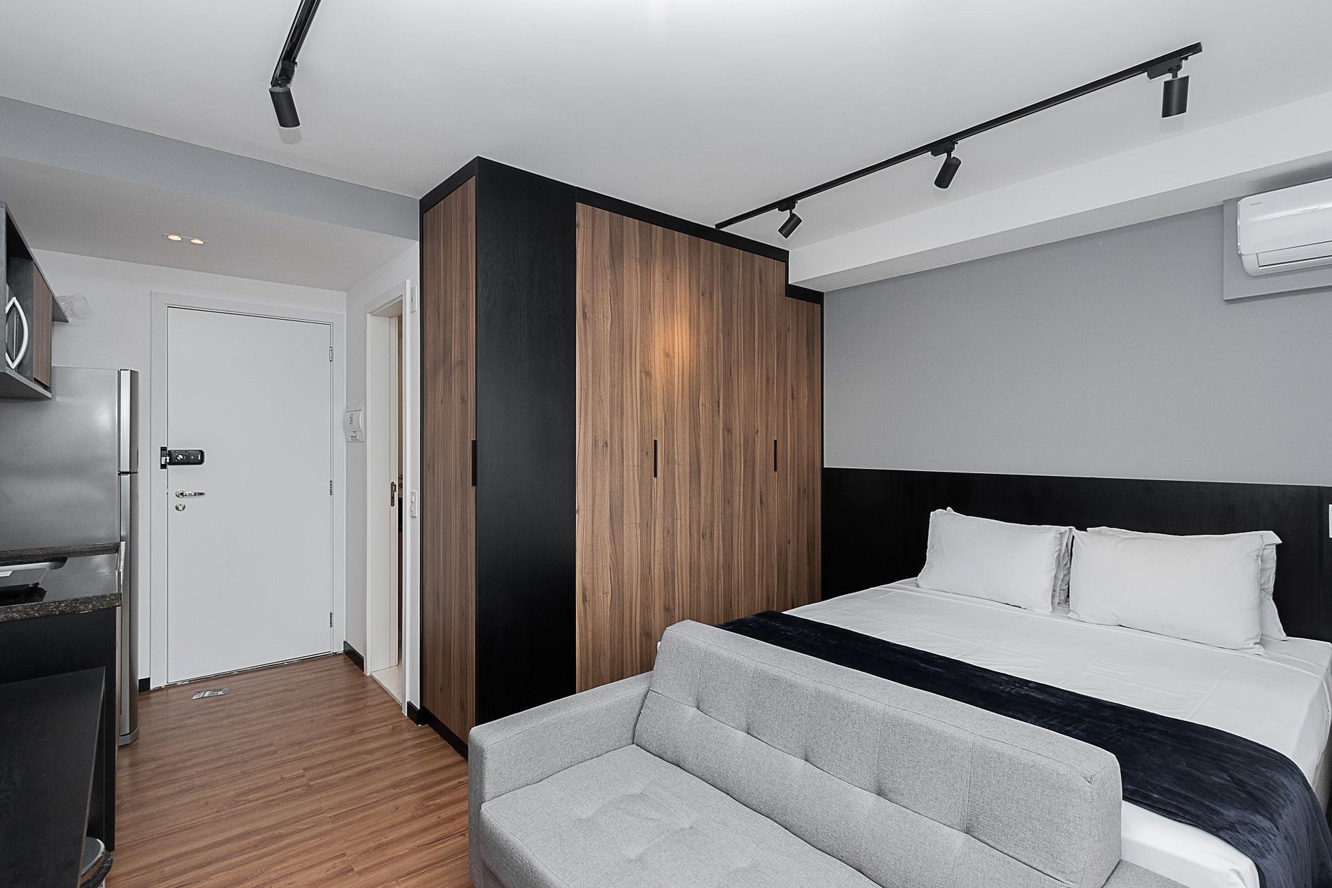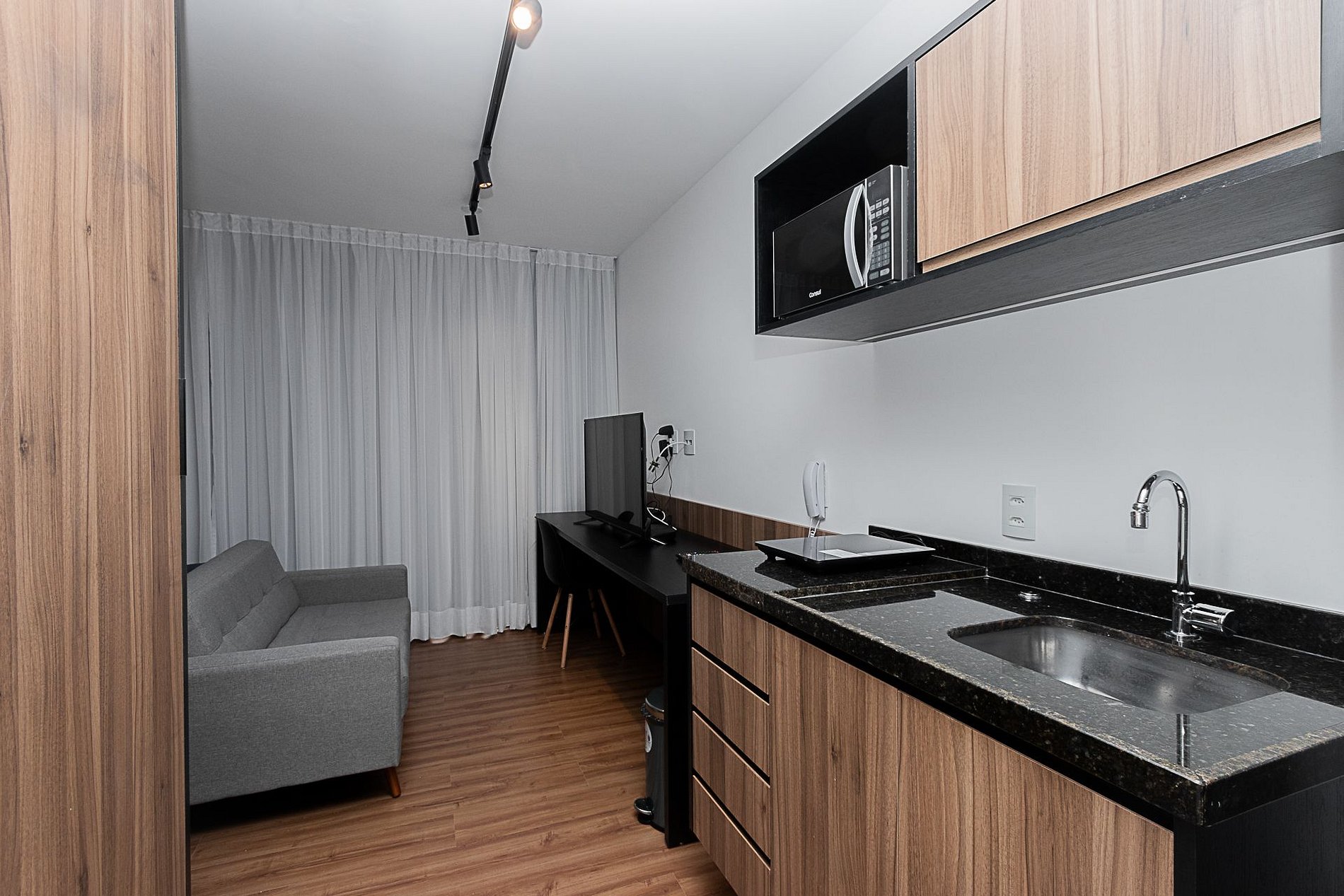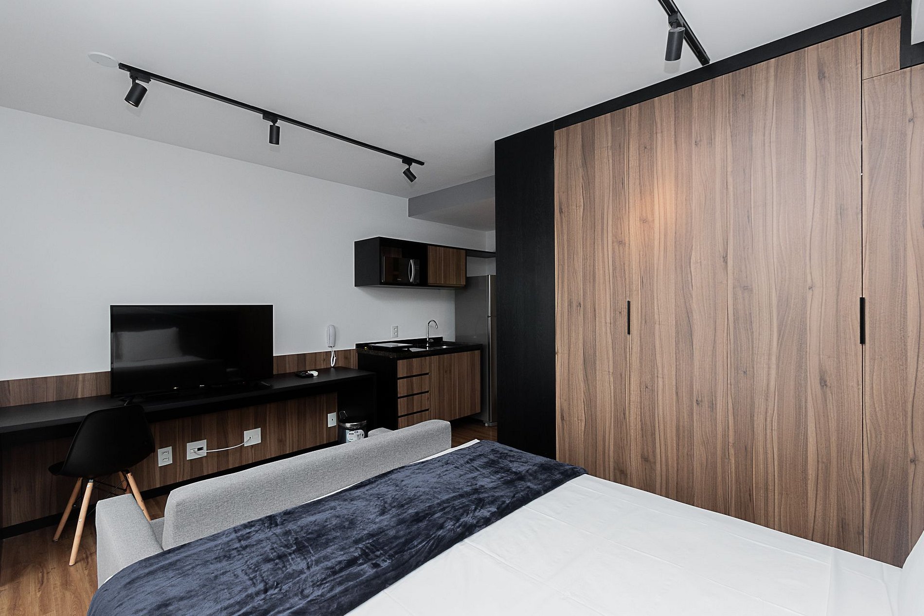 Nossos espaços são contemporâneos e práticos, oferecendo tudo o que você precisa para uma estadia confortável: Wi-Fi, TV a cabo, toalhas, roupa de cama completa e uma cozinha compacta equipada com geladeira, cooktop de indução de uma boca, micro-ondas e utensílios.